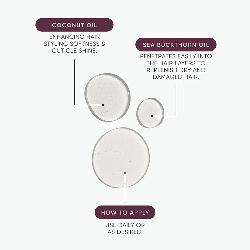 Our Signature Formula: A nourishing hair oil enriched with Coconut Oil and Sea Buckthorn Oil to revive lustre in dry or damaged hair.
